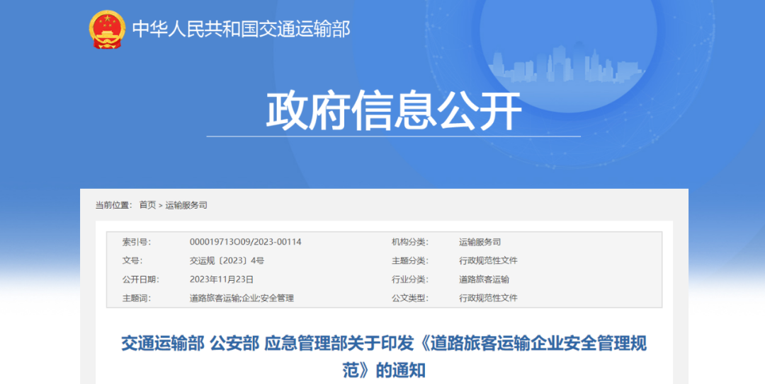 为贯彻落实《中华人民共和国安全生产法》《中华人民共和国道路运输条例》等法律法规要求,进一步规范道路旅客运输企业安全生产管理,切实保障人民群众生命财产安全,交通运输部、公安部、应急管理部修订了《道路旅客运输企业安全管理规范》。现印发给你们,请认真贯彻执行。